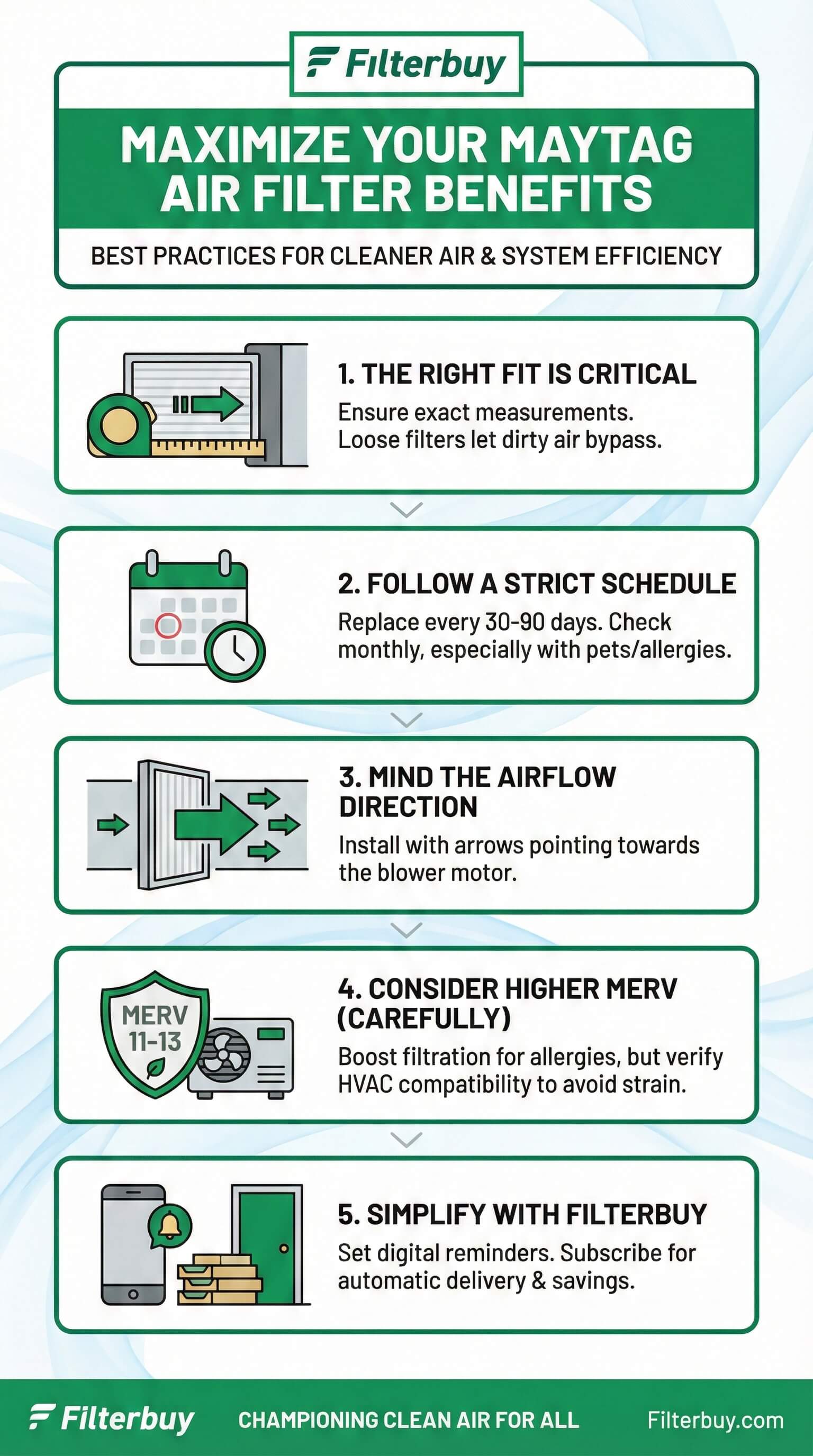 Maytag air filters are standard HVAC air filters that work in Maytag heating and cooling systems. To maximize benefits: replace every 60–90 days (30–60 days with pets/allergies), use the exact size for your system, choose MERV 8–13 for most homes, and check monthly for heavy buildup. Proper maintenance can reduce energy costs by 5–15% while significantly improving indoor air quality. Any quality filter with the correct dimensions works as a Maytag replacement—exact fit and consistent replacement matter more than brand name.